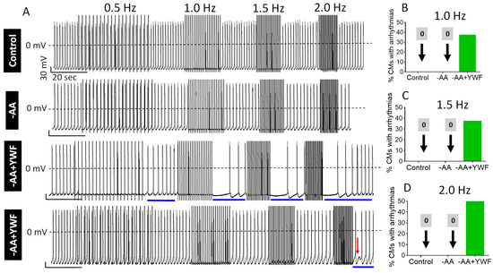 Because a variety of arrhythmias and DADs in particular, are initiated by elevated intracellular Ca2+, we tested whether in the non-arrhythmogenic, regularly firing -AA- and -AA+YWF-treated CMs, arrhythmias will be induced by rapid pacing, a condition causing diastolic Ca2+ rise [37]. The pacing protocols consist of 20-pulse trains (pulses delivered at 0.5, 1.0, 1.5, and 2.0 Hz) separated by a 20 s pause (Figure 10). Whereas in the control and -AA CMs rapid pacing did not affect the regular firing patterns, in -AA+YWF pacing caused arrhythmias (marked by the horizontal blue bars), including DADs (shown by the red arrow) and cessation of firing during the post-pacing period (Figure 10A). Notably, at 1.0, 1.5, and 2.0 Hz pacing frequencies, the arrhythmia incidence in -AA+YWF CMs was 37.5%, 37.5%, and 50%, respectively (Figure 10B–D).
