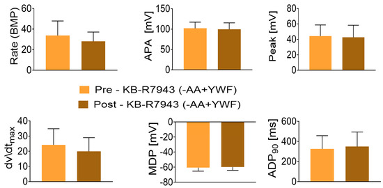 The NCX is a transmembrane protein responsible for extruding ~93% of the Ca2+ ions that enter the cell during the plateau phase of the action potential, thereby being responsible for the maintenance of Na+ and Ca2+ homeostasis in cardiomyocytes [38,39]. As DADs and OPPs are known to result from increased cytosolic Ca2+ [31,32], we hypothesized that inhibiting by KB-R7943 the reverse-mode of NCX which leads to Ca2+ influx into the cell, will alleviate cytosolic Ca2+ overload and eliminate the arrhythmias caused by -AA+YWF treatment. In support of this hypothesis, the application of KB-R7943 at 3 or 10 μM blocked the arrhythmias (Figure 11). In summary, in 11 out of the 12 experiments, 3 or 10 μM KB-R7943 blocked the arrhythmias (Figure 11A), suggesting that the inward Ca2+ influx via the NCX reverse mode mediates/contributes the arrhythmias caused by -AA+YWF treatment. To test whether, aside from blocking the arrhythmias, KB-R7943 affects CMs’ electrophysiological function, action potentials were analyzed in the CMs in which the arrhythmias were blocked by KB-R7943. As shown in Figure 12, KB-R7943 did not affect the action potential characteristics, suggesting that the anti-arrhythmic effect was specific rather than due to a general attenuation of the electrophysiological function. To negate the possibility that the anti-arrhythmic effect was caused by DMSO—the KB-R7943 solvent, we tested whether DMSO (at the same concentration used to dissolve KB-R7943) alone affects the arrhythmias in -AA+YWF CMs. Figure 11B depicts in two representative experiments (of the three performed), that DMSO does not affect the arrhythmias induced by the -AA+YWF treatment.