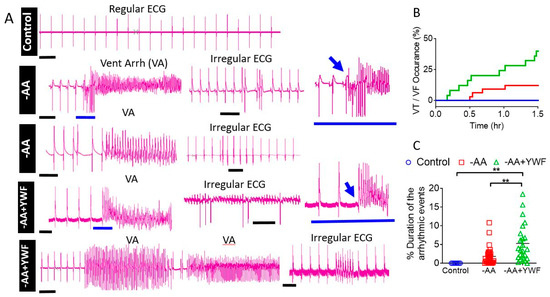 To extend the implication of the single-cell and network findings to the organ level, isolated rat hearts were retrogradely perfused for 1.5 h with the control, -AA, and -AA+YWF solutions. The study included 7 control (containing all AAs) rats, 33 -AA rats and 25 -AA+YWF rats. As illustrated by the representative ECG recordings, in the control perfusate, the ECG presents a regular beating pattern (Figure 13A). In contrast, the -AA and -AA+YWF perfusates were associated with two types of arrhythmias: (i) irregular ECG patterns, expressed as variable R–R intervals; and (ii) ventricular arrhythmias (Vent Arr, VA), including ventricular tachycardia (VT) and ventricular fibrillation (VF), which erupt abruptly, as illustrated by the blue arrows in the two inserts. In summary, whereas all the control hearts were arrhythmia-free, VA developed in 11.8% of the -AA hearts and 40% in the -AA+YWF (Figure 13B). In agreement with the differences in the occurrence of the VA events between -AA and -AA+YWF hearts, the duration of the arrhythmic events was longer (p < 0.001) in -AA+YWF than in -AA (Figure 13C). These findings are of prominent importance because they demonstrate that AA-deficient media cause arrhythmias at the single-cell, network and organ levels, as well as that the arrhythmias caused by -AA+YWF are more pronounced than those caused by -AA.