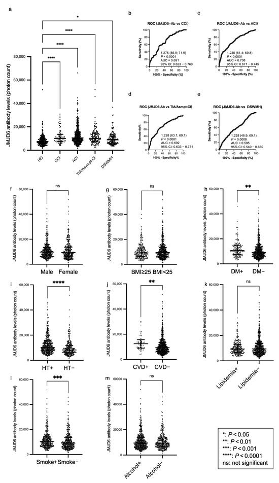 Comparison of the levels of serum anti-JMJD6 antibodies (s-JMJD6-Abs) in healthy donors (HDs) and patients with chronic cerebral infarction (CCI), acute cerebral infarction (ACI), transient ischemic attack (TIA)/asymptomatic cerebral infarction (Asympt-CI), and deep and subcortical white matter hyperintensity (DSWMH). (a) The figure shows the scatter dot plot of the levels of s-JMJD6-Abs examined using amplified luminescence proximity homogeneous assay-linked immunosorbent assay (AlphaLISA). The bars represent the medians and quartiles. The p-values were calculated using the Kruskal–Wallis test (Mann–Whitney U test with Bonferroni correction applied). Table 1 summarizes the exact values. (b–e) The capacities of s-JMJD6-Abs for detecting CCI (b), ACI (c), TIA/Asympt-CI (d), and DSWMH (e) were assessed through receiver operating characteristic (ROC) curve analysis. The numbers in the figures indicate the cutoff values for marker levels, and the numbers in parentheses indicate sensitivity (left) and specificity (right). p-values, areas under the curve (AUCs), and 95% confidence intervals (95% CI) are also shown. (f–m) The associations of s-JMJD6-Ab levels with sex (f), body mass index (BMI) (g), diabetes mellitus (DM) (h), hypertension (HT) (i), cardiovascular diseases (CVDs) including acute myocardial infarction and unstable angina pectoris (j), lipidemia (k), smoking (l), and alcohol drinking (m) were examined in the Sawara Hospital cohort. The p-values were calculated using the Mann–Whitney U test, and the bars represent the medians and quartiles; “+” indicates “presence of”; “−” indicates “absence of”.
