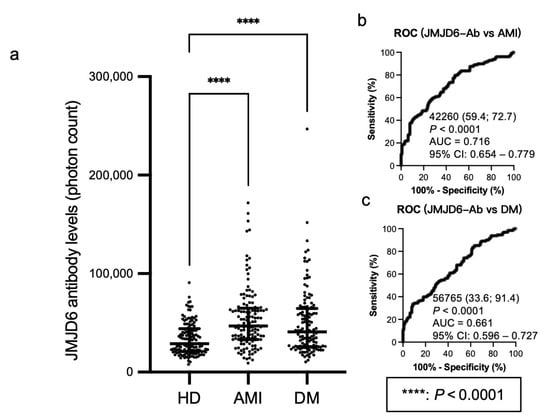 Comparison of the levels of serum anti-JMJD6 antibodies (s-JMJD6-Abs) in healthy donors (HDs) and patients with acute myocardial infarction (AMI) and diabetes mellitus (DM). (a) This figure shows the levels of s-JMJD6-Abs examined by amplified luminescence proximity homogeneous assay-linked immunosorbent assay (AlphaLISA). Antibody levels are represented by Alpha photon counts and shown in a scatter dot plot; the horizontal lines represent medians, as well as the 25th and 75th percentiles. The p-values were calculated using the Kruskal–Wallis test. (b,c) The abilities of s-JMJD6-Ab levels to detect AMI (b) and DM (c) were assessed by receiver operating characteristic (ROC) curve analysis. The numbers in (b,c) are cutoff values, sensitivity (left), specificity (right), p-values, area under the curve (AUC) values, and 95% confidence intervals (95% CI).