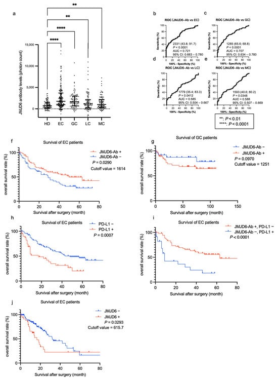 Considering previous reports on the correlation between JMJD6 and cancers, as well as the link between inflammation and cancers, we conducted further investigations using serum samples from patients with esophageal cancer (EC), gastric cancer (GC), lung cancer (LC), and mammary cancer (MC) (Table 5, upper panel). The s-JMJD6-Ab levels were significantly higher in these patients compared with those in HDs (Figure 3a and Table 5, lower panel). The positive rates of JMJD6-Ab were high in patients with EC and GC (34.9% and 30.2%, respectively; Table 5, lower panel). In addition, the AUCs of s-JMJD6-Abs were 0.721, 0.707, 0.585, and 0.588 for EC, GC, LC, and MC, respectively (Figure 3b–e). The s-JMJD6-Ab levels may be more closely associated with EC and GC than other cancer types. Thus, s-JMJD6-Ab levels could serve as useful biomarkers for detecting EC, GC, LC, and MC, with a particular emphasis on EC and GC.