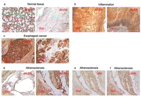 The tissue microarray (TMA) was composed of 53 samples from 18 different donors. There were 7 normal tissues, 17 esophageal carcinoma samples, 18 inflammation samples, 8 margin of carcinoma, 1 blood vessel sample, 1 smooth muscle, and 1 hyperplasia sample (diameter: 1.5 mm, thickness: 5 µm) in the TMA construction (CC02-02, Cybrdi, Frederick, MD, USA). Tissues were fixed in 4% buffered formalin and then embedded in paraffin. The TMA manufacturing process has been described previously []. Formalin-fixed paraffin-embedded atherosclerosis tissues from patients were cut into 4 µm thick sections. All tissue samples were deparaffinized, blocked with a detection kit (ab64261, Abcam, Cambridge, UK), reacted with primary anti-JMJD6 antibodies (rabbit polyclonal antibodies; GeneTex, Irvine, CA, USA), the anti-vimentin antibody (mouse monoclonal antibody; Agilent, Tokyo, Japan), and the anti-smooth muscle actin antibody (mouse monoclonal antibody; Agilent) at 2 µg/mL at 4 °C overnight, and then incubated with biotinylated anti-rabbit or anti-mouse IgG. The sections were incubated with streptavidin-conjugated horseradish peroxidase reagent. Finally, the reaction was visualized using a diaminobenzidine chromogen, and the sections were counterstained with hematoxylin, dehydrated, and mounted for storage.
