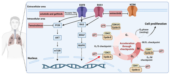 Mechanisms of lung cancer development. Dysregulation of signaling pathways, including EGFR, PI3K/AKT/mTOR, RAS-MAPK, NTRK/ROS1, and cell cycling has been implicated in lung cancer development and progression. Targeted therapies capitalizing on these pathways have emerged as a cornerstone of treatment. Inhibitors such as entrectinib, gefitinib, and temsirolimus target specific oncogenic drivers like EGFR, ROS1, and RAS, demonstrating efficacy in controlling lung cancer progression.