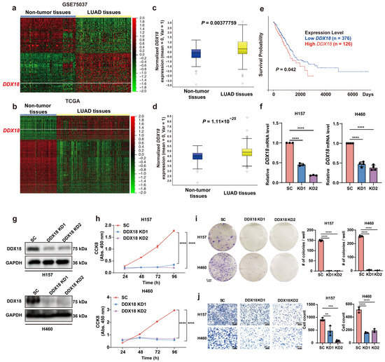 To evaluate the clinical significance of DDX18 expression in LUAD, we analyzed publicly available datasets. DDX18 mRNA levels were significantly higher in LUAD tissues compared to adjacent normal tissues in both the GSE75037 dataset (Figure 2a,c) and The Cancer Genome Atlas (TCGA) data (Figure 2b,d). Additionally, high DDX18 expression correlated with poor prognosis in LUAD patients (Figure 2e).