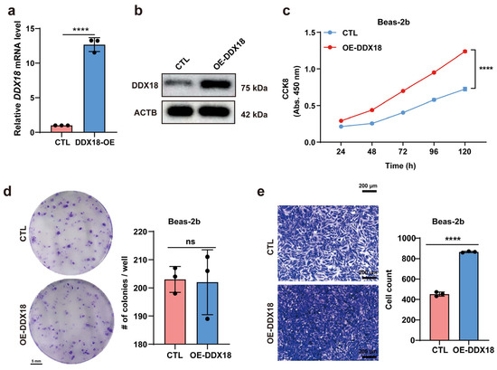 Building on the observation that DDX18 silencing suppressed proliferation and migration of LUAD cells, suggesting its oncogenic role in LUAD, we hypothesized that DDX18 overexpression might promote proliferation in non-malignant lung cells. Beas-2B cells were stably transduced with lentiviral vectors expressing DDX18. RT-PCR and Western blot analyses confirmed efficient DDX18 overexpression at both mRNA and protein levels (Figure 3a,b). Notably, DDX18 overexpression significantly enhanced Beas-2B cell proliferation as measured by the CCK8 assay (Figure 3c). However, colony formation assays revealed no significant difference in clonogenic survival between control and DDX18-overexpressing Beas-2B cells (Figure 3d). Conversely, DDX18 overexpression demonstrably increased the migratory capacity of Beas-2B cells (Figure 3e).