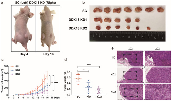 To evaluate the in vivo role of DDX18 in LUAD tumorigenesis, H460 cells expressing either scramble shRNA (control) or DDX18 shRNA were injected subcutaneously into the left and right flanks, respectively, of nude mice. Representative images of tumor-bearing mice were captured at 4 and 16 days post-injection (Figure 4a,b). Compared to control tumors, DDX18 knockdown significantly suppressed LUAD tumor growth, as evidenced by reduced tumor volume (Figure 4c) and weight (Figure 4d). Hematoxylin and eosin (H&E) staining revealed a looser cell organization in DDX18 knockdown tumor sections compared to controls (Figure 4e). These findings demonstrate that DDX18 is essential for LUAD tumorigenesis.