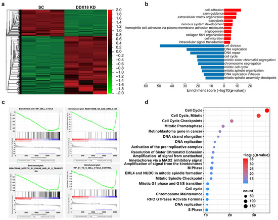 RNA sequencing analysis was performed to comprehensively identify genes regulated by DDX18 in H460 LUAD cells. Compared to scramble control cells, DDX18 knockdown resulted in differential expression of over 2507 genes (fold change > 2.0) (Figure 5a). Functional enrichment analysis using KEGG pathways and Gene Ontology (GO) terms revealed a significant enrichment of differentially expressed genes (DEGs) in cell cycle-associated pathways. The top 10 enriched GO terms for upregulated and downregulated genes are presented in Figure 5b. Gene Set Enrichment Analysis (GSEA) further confirmed that the cell cycle pathway was significantly deregulated in DDX18-depleted LUAD cells (Figure 5c). Within the biological process (BP) category, GO enrichment analysis identified the most significant enrichments in categories related to “cell cycle,” “mitotic cell cycle,” and “cell cycle checkpoints” (Figure 5d). These findings suggest that DDX18 plays a critical role in regulating cell cycle progression in LUAD cells.