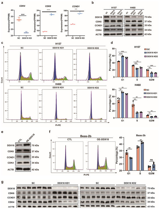 RNA-seq analysis identified CDK4, a key cell cycle regulator, as downregulated upon DDX18 knockdown in H460 cells (Figure 6a). CDK4 deregulation is a well-established hallmark of various cancers. Interestingly, CDK6 and CCND1, both associated with G1-S phase transition, were upregulated in the absence of DDX18 (Figure 6b). This suggests that DDX18 might regulate cell proliferation by specifically targeting CDK4, a critical G1 phase checkpoint protein. Western blot analysis confirmed that protein levels of CDK4 mirrored the RNA-seq data, whereas CDK6 and CCND1 were upregulated following DDX18 knockdown (Figure 6b). Flow cytometry analysis revealed a significant G1 arrest in H460 and H157 cells with DDX18 knockdown, as evidenced by the increased G1 cell population (Figure 6c,d). Conversely, DDX18 overexpression in Beas-2B cells led to increased protein levels of CDK4, CDK6, and CCND1 (Figure 6e) and altered cell cycle distribution with changes observed across G1, S, and G2/M phases (Figure 6f). Notably, protein levels of CDK4, CDK6, and CCND1 in nude mice xenografts mirrored those observed in cell lines (Figure 6g). These findings collectively suggest that DDX18 regulates cell cycle progression, potentially through CDK4 modulation.
