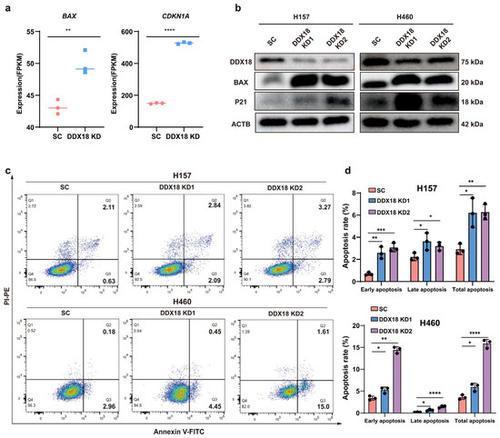 RNA-seq analysis revealed upregulation of apoptosis-related genes CDKN1A (P21) and BAX upon DDX18 knockdown in H460 cells (Figure 7a). Western blot analysis confirmed these findings, demonstrating increased protein levels of P21 and BAX following DDX18 knockdown (Figure 7b). To investigate whether apoptosis contributes to the growth inhibition observed in DDX18-depleted H460 and H157 cells, we performed flow cytometry analysis with Annexin V/PI double staining. This analysis revealed a significant increase in the total apoptotic cell population following DDX18 knockdown (Figure 7c,d). Collectively, these results suggest that DDX18 knockdown promotes apoptosis in LUAD cells.