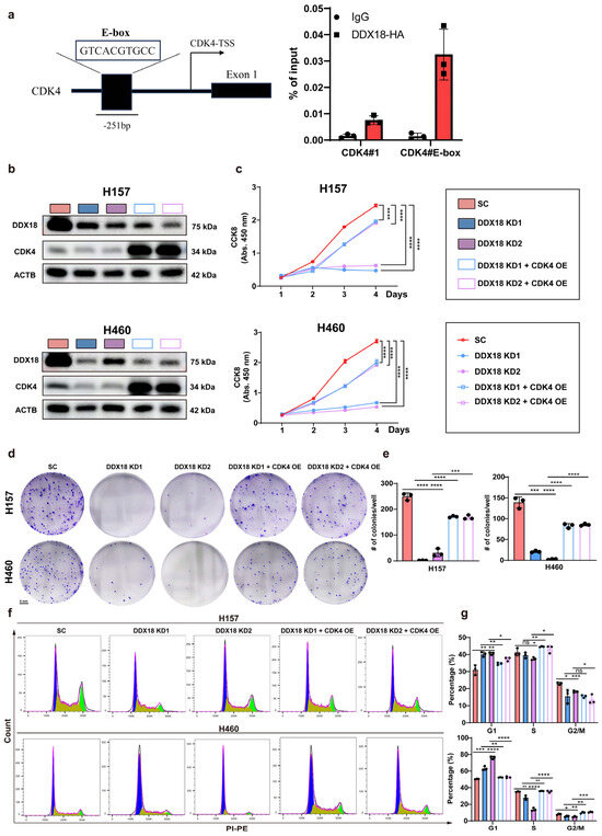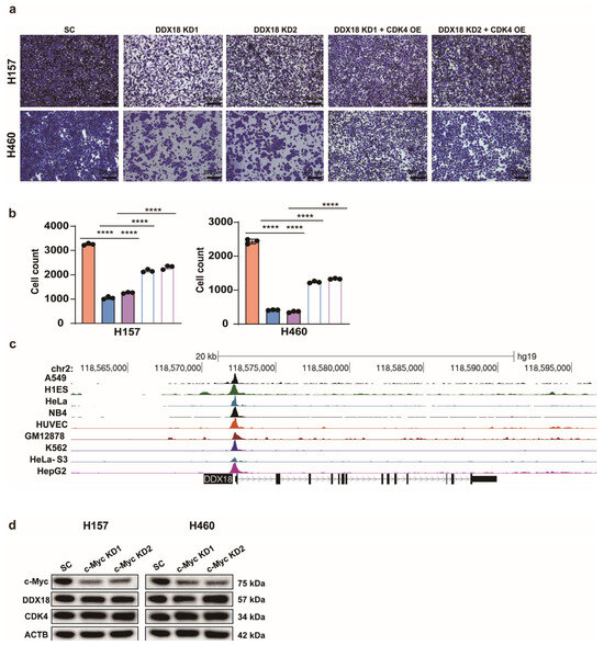We identified a potential E-box element (GTCACGTGCC) located 251 bp upstream of the CDK4 transcriptional start site (TSS) (Figure 8a, left panel) based on the previous literature [33]. To investigate DDX18 interaction with this E-box in H460 cells, we constructed an overexpression vector expressing HA-tagged DDX18 and established H460 cells stably expressing this construct. Chromatin immunoprecipitation (ChIP) assay using an anti-HA antibody revealed enrichment of the CDK4 promoter E-box region compared to a non-binding region 1798 bp upstream of the TSS (Figure 8a, right panel). These findings suggest that DDX18 potentially binds to the CDK4 promoter.