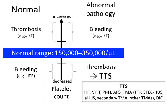 Platelet count abnormalities and clinical features. Normally, an increased platelet count increases the risk of thrombotic events, while a decreased platelet count increases the risk of bleeding. However, ET is a disease that presents with bleeding symptoms despite an increased platelet count. Diseases that present with thrombosis despite low platelet counts are termed TTS, which include HIT, VITT, PNH, APS, TMA, and DIC. TMA is classified as TTP, STEC-HUS, aHUS, secondary TMA, and other TMAs. Abbreviations: ET, essential thrombocythemia; ITP, idiopathic thrombocytopenic purpura/immune thrombocytopenia; TTS, thrombosis with thrombocytopenia syndrome; HIT, heparin-induced thrombocytopenia; VITT, vaccine-induced immune thrombotic thrombocytopenia; PNH, paroxysmal nocturnal hemoglobinuria; APS, antiphospholipid antibody syndrome; TMA, thrombotic microangiopathy; TTP, thrombotic thrombocytopenic purpura; STEC-HUS, Shiga toxin-producing Escherichia coli-associated hemolytic uremic syndrome; aHUS, atypical hemolytic uremic syndrome; DIC, disseminated intravascular coagulation.