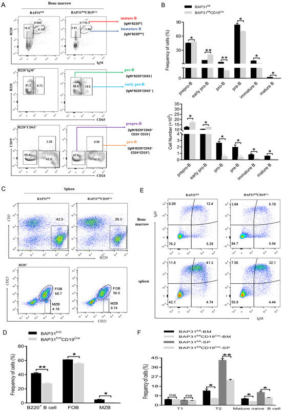 The mature naïve B cell repertoire consists of three well−defined populations: B1, B2 (follicular B, FOB), and marginal zone B (MZB) cells [13]. B cells develop in the BM from HSCs. We first assessed the effects of the knockout of BAP31 on B cell progenitor populations in in the bone marrow B cells. Notably, bone marrow B cell subsets, including pro−B cells, pre−B cells, immature B cells, and mature B cells were significantly fewer in BAP31fl/flCD19Cre mice, while there were slightly increased prepro−B cells and early pro−B cells. These results are good indications for BAP31 deficiency impairing early B cell development at the early pro− to pro−B cell transition stage. The knockout of BAP31 also reduces bone marrow and splenic T2 cells and mature naïve B cells. Lower numbers of splenic B220+ B cells, marginal zone B, and follicular B cells indicate a possible maturation defect in BAP31-BCKO B cells in the spleen. A lack of BAP31 results in a reduction in B220+ cells in peripheral lymphoid organs and is associated with B cell development. Altogether, BAP31 impairs B cell differentiation at the earliest stage of development.