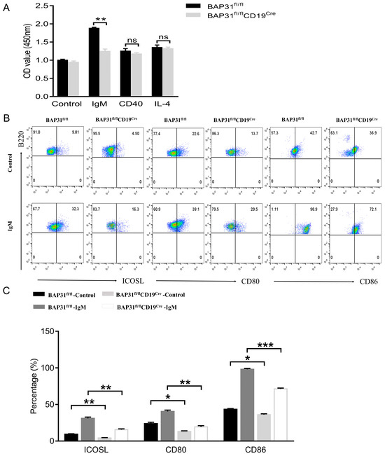 Reductions in B cell populations have been observed in BAP31fl/flCD19Cre mice. To determine the direct effects on B cells, we analyzed B cell proliferation. The co−stimulation of B cells through different co−receptors modulates B cell activation [14]. In our study, we observed a significant decrease in the proliferating capacities of B cells in BAP31fl/flCD19Cre mice; the B cells’ proliferation ability was apparently decreased after anti−IgM treatment. This result reflects a specific involvement of BAP31 in B cell proliferation via IgM/BCR signaling. Molecules involved in B cell activation were further investigated. ICOSL was selected as a marker of B cell activation [15]. CD80 and CD86 are markers of B cell activation, thus suggesting the activated state of the B cells in the different study groups [16]. Therefore, the expressions of distinct molecules associated with B cell activation were evaluated under IgM stimulation conditions. Our results demonstrate significantly decreased levels of activation in BAP31−knockout B cells compared to B cells from BAP31fl/fl mice. Considering the expression of co−stimulatory molecules in control and IgM−treated B cells, the fold increase values were no significant difference between the groups. This suggests that BAP31 knockout B cells are not actually defective in activation. Rather, due to the reduced BCR signaling in BAP31 knockout B cells, they are unresponsive to IgM stimulation. Our results illustrate that BAP31 deficiency impairs the BCR-induced activation of B cells.