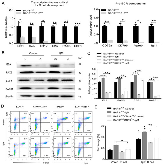Various transcription factors involved in different stages of B cell development, such as E2A, EBF1, and Pax5, work in concert to guide B cell development. Changes in the gene expression of transcription factors crucial for B cell development and pre−BCR components of BAP31fl/fl mice and BAP31fl/flCD19Cre mice bone marrow were measured by means of quantitative real−time PCR (Figure 4A). The results show that the expression levels of pre-BCR components and various transcriptional factors in the bone marrow of BAP31fl/flCD19Cre mice were significantly lower compared to BAP31fl/fl mice. In this study, we analyzed the protein expression level of key transcription factors involved in B cell development and function. We confirmed the expression of E2A, EBF1, and PAX5 in B cells from both BAP31fl/fl mice and BAP31fl/flCD19Cre mice using Western blot analysis. The results of the experiments indicate that the expression of transcription factors for B cell development, E2A, PAX5, and EBF1, were down-regulated in BAP31fl/flCD19Cre mice (Figure 4B,C). We also analyzed the protein expression levels of pre−BCR components. We confirmed the expressions of Vpreb and Igλ in B cells from both BAP31fl/fl mice and BAP31fl/flCD19Cre mice using FACS analysis. The results of the experiments indicate that the expressions of pre−BCR components, Vpreb and Igλ, were down-regulated in BAP31fl/flCD19Cre mice (Figure 4D,E).
