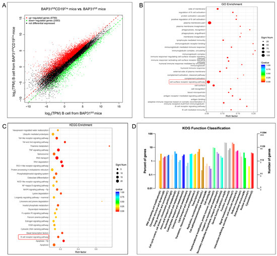 Differences in genes and pathways analyzed using bioinformatics from the BAP31fl/fl mice and BAP31fl/flCD19Cre mice of B cells. (A) Scatter plot of transcriptome sequencing results of splenic B cells from the BAP31fl/fl and BAP31fl/flCD19Cre mice. (B) Bubble graph of the GO enrichment results of the splenic B cells from BAP31fl/fl mice and BAP31fl/flCD19Cre mice. Each point represents the ratio of genes within the indicated gene ontology term to the total number of differentially expressed genes. The color of the points reflects the adjusted significance level (Q-value), as indicated by the scale. The size of a point reflects the number of genes represented by the point (count), as indicated. (C) Enrichment plots of the KEGG pathway analysis with the highest score and lowest p value for the enrichment score. (D) KOG function classification was performed for the splenic B cells from the BAP31fl/fl and BAP31fl/flCD19Cre mice.