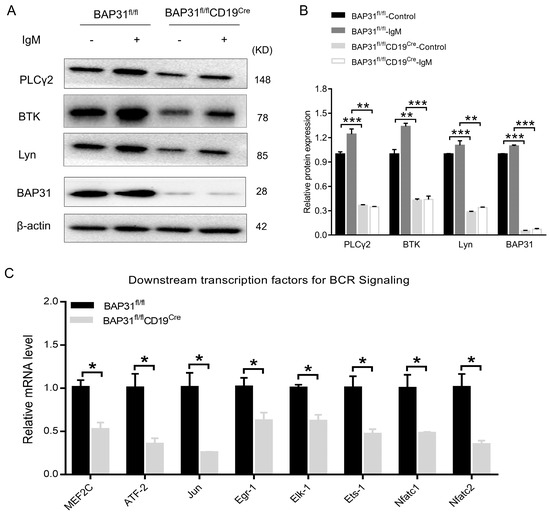 From the results of bioinformatics analysis, we further analyzed the expression changes of critical BCR pathway members in splenic B cells from both BAP31fl/fl mice and BAP31fl/flCD19Cre mice, including PLCγ2, BTK, and Lyn, via Western blot. The results of the experiments indicate that the expressions of PLCγ2, BTK, and Lyn were down-regulated in BAP31fl/flCD19Cre mice (Figure 6A,B). We also characterized the BCR signaling status of the B cell population in BAP31fl/flCD19Cre mice; the downstream transcription factors of BCR signaling were detected in splenic B cells by means of qRT–PCR. The results show that the relative mRNA levels of key molecules of the BCR signaling pathway were decreased significantly in BAP31fl/flCD19Cre mice compared to those in BAP31fl/fl mice, and the gene expression levels were further reduced in BAP31fl/flCD19Cre mice (Figure 6C). Our results demonstrate that the knockout of BAP31 inhibits B cell receptor (BCR) signaling, thereby leading to attenuated BCR signaling.