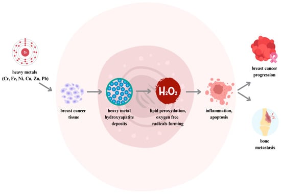 A 2022 meta-analysis by Batyrova et al. indicated that the Cr levels in hair samples from female patients with breast cancer were significantly elevated in comparison to samples from healthy women []. One of the proposed theories of how Cr contributes to breast cancer is that the element may affect the levels of lipids and other small-molecule metabolites in the blood that may be involved in the development of breast cancer []. Elevated Cr levels can lead to lipid peroxidation and the increased formation of free radicals and reactive oxygen species and can also activate estrogen receptors, resulting in the promotion of breast cancer cell proliferation [,,,]. A 2016 study by Romanjuk et al. showed the involvement of a pathological tissue biomineralization process in breast cancer progression []. Chromium and other heavy metals entering tumor tissues replace calcium in hydroxyapatite particles, initiating local inflammation in the area of the foreign body and increasing cell division, the synthesis of MMPs, and the formation of bone metastases []. Biomineralization and intense inflammatory infiltration in ductal breast cancer are unfavorable histological markers []. The process of pathological biomineralization and its consequences in breast cancer are shown in Figure 1.