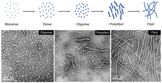 In general, tau aggregation proceeds through multiple stages: monomers (native) → dimers (misfolded) → oligomers (granules) → protofibrils (short rods) → fibrils/filaments (insoluble threads) [87,88,89,90] (Figure 3). Here, dimers and low-n oligomers may be considered prenucleation clusters, while high-n oligomers are nuclei for fibril growth. The formation of oligomers is considered primary nucleation, while secondary nucleation may occur when fragments break off from fibrils and serve as seeds for templated misfolding [91]. The nomenclature of tau aggregates based on size and shape is loosely defined, without a general consensus. Here, we consider granules with diameters of 4–40 nm as oligomers, short rods with lengths of 40–400 nm as protofibrils (also called short fibrils or short filaments), and fibers longer than 400 nm as filaments/fibrils. These three species may be semi-purified based on density differences using sucrose gradient centrifugation [89,92]. In our experience, a more stringent separation of protofibrils, high-n oligomers, and low-n oligomers may be achieved by size exclusion chromatography (SEC) using large-pore resins (~200 nm). High-n oligomers (>20) are also called high-molecular-weight tau aggregates. Transmission electron microscopy (TEM) images of fibrils (recombinant tau induced by heparin), SEC-purified protofibrils, and SEC-purified high-n oligomers are shown in Figure 3.