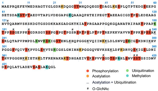 Figure 4. Tau PTM distributions. The amino acid sequence of 2N4R tau is labeled with sites of O-GlcNAc glycosylation [95], phosphorylation, acetylation, ubiquitination, and methylation [94].