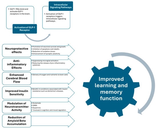 - Du, H.; Meng, X.; Yao, Y.; Xu, J. The mechanism and efficacy of GLP-1 receptor agonists in the treatment of Alzheimer’s disease. Front. Endocrinol. 2022, 13, 1033479. [Google Scholar] [CrossRef] [PubMed]