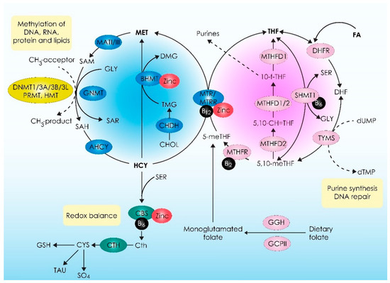 Outline of One-Carbon Metabolism and its related metabolic pathways. DHFR: dihydrofolate reductase; DHF: dihydrofolate; TYMS: thymidylate synthase; 5,10-meTHF: 5,10-methylene-tetrahydrofolate; MTHFR: 5,10-methylenetetrahydrofolate reductase; 5-meTHF: 5-methylenetetrahydrofolate; B12: vitamin B12; B2: vitamin B2; B6, vitamin B6; MTR: methionine synthase; MTRR: methionine synthase reductase; THF: tetrahydrofolate; MTHFD: methylenetetrahydrofolate dehydrogenases; 10-f-THF: 10-formyl-tetrahydrofolate; MTHFD1/2: methylenetetrahydrofolate dehydrogenase; 5,10-CH = THF: 5,10-methenyl-tetrahydrofolate; SHMT: serine hydroxymethyltransferase; SER: serine; GLY: glycine; FA: folic acid; dUMP: deoxyuridine monophosphate; dTMP: thymidine monophosphate; MET: methionine; MATI/III: methionine adenosyltransferase; SAM: S-adenosylmethionine; SAH: S-adenosylhomocysteine; GNMT: glycine N-methyltransferase; SAR: sarcosine; AHCY: S-adenosyl-l-homocysteine hydrolase; HCY: homocysteine; CHOL: choline; CHDH: choline dehydrogenase; TMG: trimethylglycine/betaine; BHMT: betaine-homocysteine S-methyltransferase; DMG: dimethylglycine; DNMT1/3A/3B/3L: de novo and maintenance DNA methyltransferases; HMT: histone methyltransferase; PRMT: protein arginine methyltransferase; CBS: cystathionine ß-synthase; Cth: cystathionine; CTH: cystathionine γ-lyase; GSH: glutathione; TAU: taurine; SO4: sulphate; GGH: γ-glutamyl hydrolase; GCPII: glutamate carboxypeptidase.
