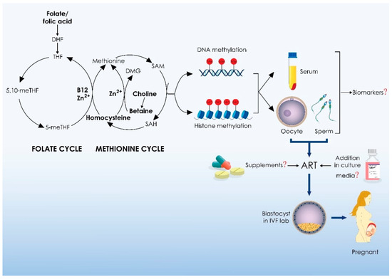 The role of various vitamins has been investigated in the context of improving MAR outcomes. Among the variety of micronutrients that are required during pregnancy besides folate, vitamin B12 seems to be of significant importance in controlling and altering DNA methylation patterns by regulating the transfer of methyl groups through 1-C metabolism [273]. Particularly, vitamin B12 seems to play an essential role in the regulation of DNA methylation processes, exerting its action through participation in homocysteine metabolism [274]. When a methyl group is transferred to homocysteine to form methionine, vitamin B12 acts as a co-factor for the methionine synthase enzyme [274,275].
