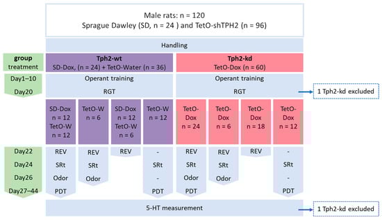 Figure 1). Control animals (Tph2-wt) included 36 TetO-shTPH2 rats treated with water (TetO-water) and 24 SD rats treated with Dox (SD-Dox). Tph2-knockdown (Tph2-kd) group included the 60 TetO-shTPH2 rats treated with Dox (TetO-Dox). Number of animals for each test and exclusion criteria are reported in