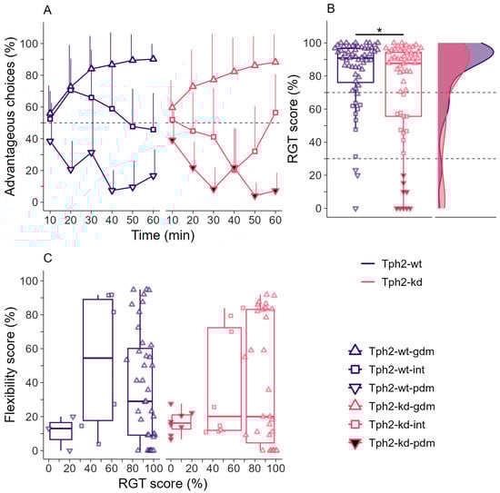 p-value = 0.067, after 10 min: Tph2-wt-gdm 56 + 17 (mean + sd), Tph2-wt-int 52.5 + 17, Tph2-wt-pdm 38.5 + 24, Tph2-kd-gdm 59.6 + 17, Tph2-kd-int 52 + 11, Tph2-kd-pdm 39.2 + 18). For good decision makers (upward triangles) the percentage of advantageous choices increased until reaching a very high preference at the end of the test (above 70%). For poor decision makers (downwards triangles) the percentage of advantageous choices decreased until reaching a very low preference at the end of the test (below 30%). For intermediate individuals (squares) the percentage of advantageous choices stayed at approximately 50% until the end of the test (between 70% and 30%). More disadvantageous choices (RGT score < 30%) were made by Tph2-kd rats than by Tph2-wt rats (