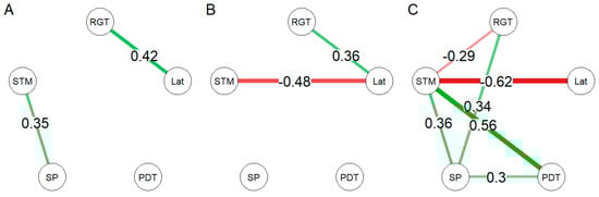 Figure 4A,B). The network of low-serotonin poor decision makers (n = 5) revealed a central position of STM with strong connections between STM and all other functions (