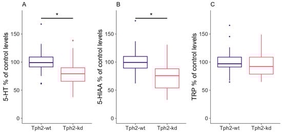 p-value = 0.1141). The ratio of 5-HIAA/TRP indicated a consistent decrease in serotonin metabolism in Tph2-kd animals independent of the duration of the treatment (