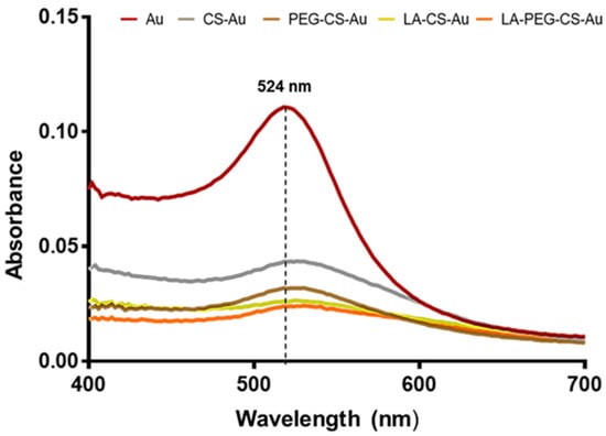 Synthesis of the AuNPs via citrate reduction was successfully achieved, followed by stabilization of the NPs with chitosan (CS) and polyethylene glycol (PEG). The UV–visible (UV-vis) absorption spectra (Figure 1) show the typical absorbance peak for citrate-reduced colloidal AuNPs with a well-defined absorption band and a characteristic λmax at 524 nm. This value agreed with the surface plasmon resonance (SPR) absorption of nanosized gold particles []. The adsorption of CS onto the surface of the AuNPs was confirmed by a reduction in the absorbance peak intensity and a redshift in wavelength, which also denoted an increase in particle size [,].