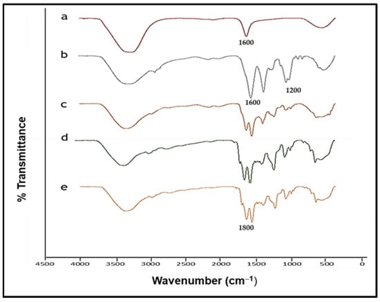 FTIR spectra of (a) AuNP, (b) CS-Au, (c) PEG-CS-Au, (d) LA-CS-Au, and (e) LA-PEG-CS-Au.
