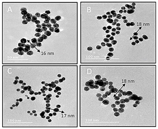 Transmission electron microscopy (TEM) further assessed the size and ultrastructural morphology of the AuNPs and their nanocomplexes (Table 1, Figure 3). TEM images revealed no significant difference in appearance between the AuNPs and the FAuNPs CS-AuNPs. AuNPs appeared to be highly monodisperse, with sizes varying from 13 nm to 18 nm. The nanocomplexes were also found to be similar and monodisperse, with sizes varying from 20 to 25 nm. The slightly larger sizes could be due to the conjugation of the pDNA to the FAuNPs. Subsequent observations showed no structural modifications, such as aggregation or absorption changes for the particles.