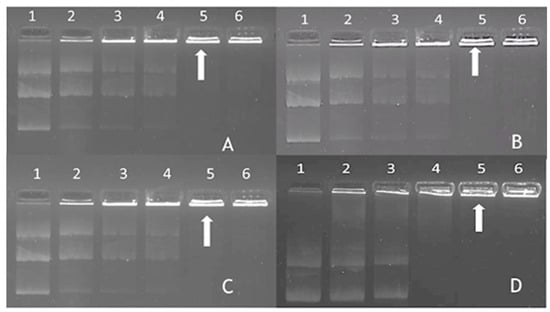 Gel retardation assay of nanocomplexes. pCMV-Luc DNA was kept constant (0.25 µg) in all lanes. (A) CS-Au NPs, lanes 1–6 (0, 0.25, 0.4, 0.5, 1.5, and 2.5 µg). (B) PEG-CS-Au NPs, lanes 1–6 (0, 0.25, 0.5, 1, 2, and 2.5 µg). (C) LA-CS-Au NPs, lanes 1–6 (0, 0.25, 0.5, 1, 1.5, and 2.5 µg). (D) LA-PEG-CS-Au NPs, lanes 1–6 (0, 0.25, 0.5, 1, 1.5, and 2 µg). Arrows indicate optimal pDNA binding.
