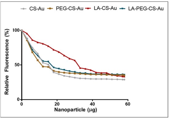 The CS-AuNPs produced greater fluorescence decay levels than the PEGylated and galactosylated AuNPs. This observation of compaction was confirmed with a maximum percentage fluorescence decay of 79.3% for the CS-AuNPs with 70.6%, 65.4%, and 70.3% for the PEG-CS-AuNPs, LA-CS-AuNPs, and LA-PEG-CS-AuNPs, respectively. Overall, all nanocomplexes showed a steady decline in fluorescence, suggesting that the nanocomplexes were stable and efficiently bound the pDNA.