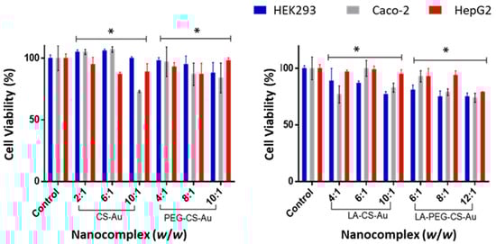 Cell viability of nanocomplexes in the HEK293, Caco-2, and HepG2 cells. Control = untreated cells. Data are represented as mean ± SD (n = 3). * p < 0.005 was considered to be statistically significant.