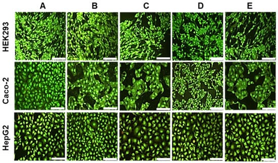 Fluorescent images of the HEK293, Caco-2, and HepG2 cells at 20× magnification. (A) control cells (B) CS-AuNP/pDNA (C) PEG-CS-AuNP/pDNA, (D) LA-CS-AuNP/pDNA, and (E) LA-PEG-CS-AuNP/pDNA at their optimum binding ratios. Scale bar = 100 μm.