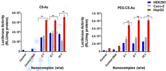 Luciferase activity in HEK293, Caco-2, and HepG2 cells treated with the untargeted nanocomplexes (CS-Au:pDNA and PEG-CS-Au:pDNA). Control = untreated cells, control DNA = naked pDNA. Data are presented as mean ± SD (n = 3). ** p < 0.001 was considered statistically significant.