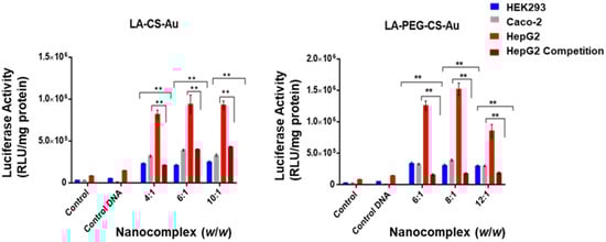 Luciferase activity in the HEK293, Caco-2, and HepG2 cells treated with the targeting nanocomplexes (LA-CS-Au:pDNA and LA-PEG-CS-Au:pDNA). Excess LA was added to the HepG2 cell for the competition assay prior to nanocomplex addition. Control = untreated cells, and control DNA = naked pDNA. Data are presented as mean ± SD (n = 3). ** p < 0.001 was considered statistically significant.