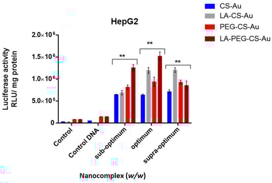 Figure 11 is a consolidated graphical representation showing the difference in the targeted and non-targeted nanocomplexes in the HepG2 cells, confirming that the incorporation of the targeting ligand LA significantly impacted luciferase expression. The high transgene expression elicited by the LA-CS-Au/pDNA and LA-PEG-CS-Au/pDNA nanocomplexes in the HepG2 cells could be attributed to their rapid internalization by RME. To corroborate this claim, a competition assay was conducted to assess if cellular uptake of the targeted nanocomplexes occurred via RME. This was performed by pre-incubating the cells with excess free LA before transfection. The excess LA is bound to the receptors, preventing the LA-CS-Au/pDNA and LA-PEG-CS-Au/pDNA nanocomplexes from entering the cells via receptor mediation. The results showed a significant decline in gene expression (approximately 88%), thus confirming that the uptake of the LA-targeted nanocomplexes was receptor-mediated, as seen in the earlier literature []. Furthermore, there was a difference in the transfection activity for the targeted nanocomplexes in the three cell lines. The luciferase activity in the HepG2 cells showed a notable increase in transgene activity compared to that in the receptor-negative cell lines (HEK293 and Caco-2). Hence, clear evidence has been shown that the LA-CS and LA-PEG-CS-AuNPs were successful in cell-specific targeting and are suitable cell-specific carriers of genes.