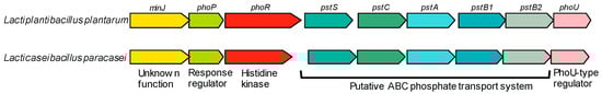 A PhoPR TCS has been studied in Lacticaseibacillus paracasei BL23 (originally named TC04; PhoP, LCABL_10480, PhoR, LCABL_10490), showing that mutating the response regulator phoP resulted in slow growth and acid sensitivity in an MRS medium []. This TCS was adjacent to a pstSCAB1B2-phoU gene cluster (Figure 1), but this operon has not been studied in any member of the Lactobacillaceae family. The inspection of available genome sequences within the Lactobacillaceae family showed this typical organization (Supplementary Figure S2; []), in which a phoU gene also follows a pstSCAB cluster. This operon generally carried two tandem copies of the ATPase-encoding gene pstB (pstSCAB1B2), and phoPR genes were found upstream.