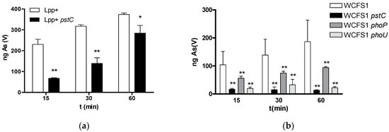 The incorporation of As(V) in Lp. plantarum strains and their derivative mutants affected in pst and pho genes (a) L. plantarum Lpp+; (b) Lp. plantarum WCFS1. Columns represent average amounts of As retained by 300 μL of bacterial cells at an OD595 of 10 when exposed to 5 mg/L of As(V) (n = 3). Error bars represent standard deviations. * (p < 0.05); ** (p < 0.01), statistical differences with respect to the wild-type strain for each time point.