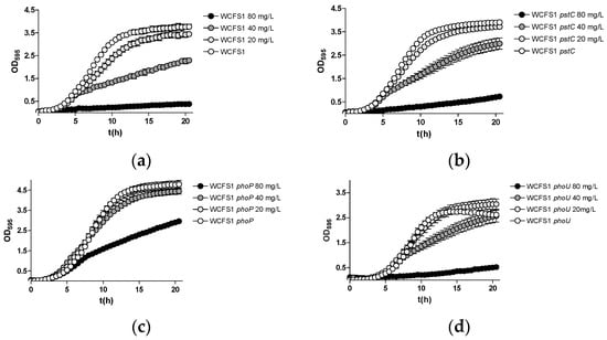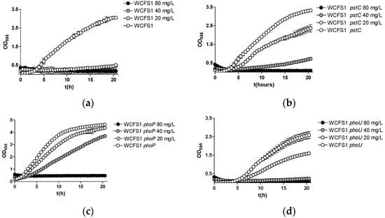 Growth curves of Lp. plantarum WCFS1 and different pst- and pho-derived mutants in the MEI medium (high phosphate) with different amounts of As(V) indicated in mg/L. (a) Wild type; (b) pstC mutant; (c) phoP mutant; (d) phoU mutant.
