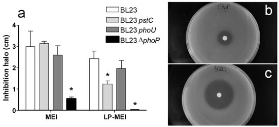 (a) Diameters of inhibition haloes of As(III) on MEI (high phosphate) and LP-MEI (low phosphate) plates seeded with different strains of Lc. paracasei BL23 wild-type and mutants in pst and pho genes. Columns represent average diameters (n = 3). Error bars represent standard deviations. Asterisks indicate statistical differences compared to the wild type for each growth condition (p < 0.01). (b) The inhibition halo of As(III) on the MEI plate seeded with the Lc. paracasei ΔphoP mutant. (c) Lc. paracasei BL23.