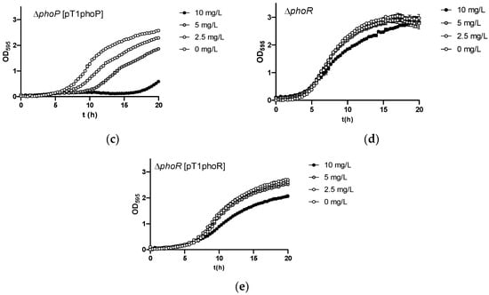 Growth curves of Lc. paracasei BL23 and phoP or phoR mutants and their complemented strains in the MEI medium with different amounts of As(III). (a) BL23 (wild type); (b) ΔphoP; (c) ΔphoP [pT1phoP], complemented strain; (d) ΔphoR; (e) ΔphoR[pT1phoR], complemented strain.