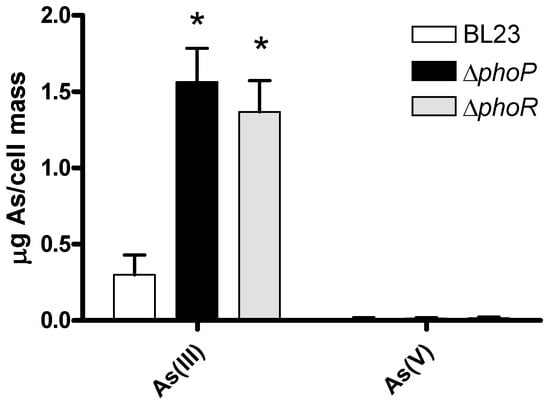 To determine As(III) oxidation to As(V) by Lc. paracasei cells, 50 mL of the MEI medium containing 5 mg/L of As(III) was inoculated with Lc. paracasei BL23 and their derived ΔphoP and ΔphoR mutants at an initial OD at 595nm of 0.01. After 16 h of incubation at 37 °C, cells were washed at 4 °C with cold 0.9% NaCl (4000× g, 10 min) and the bacterial pellets were kept at −20 °C until the analysis. iAs was extracted from bacterial pellets with 5 mL of 0.28 M HNO3 at 95 °C for 1.5 h [] and the As(III) and As(V) contents were determined by HPLC with an anion exchange column (Hamilton PRP X100, 150 × 4.1 mm, particle size: 5 μm; Hamilton Bonaduz AG, Bonaduz, Switzerland) coupled to a PerkinElmer Nex-Ion™300X ICP-MS (PerkinElmer, Waltham, MA, USA) as described [].
