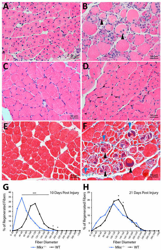 Delayed muscle regeneration in Mkx−/− mice following Cardiotoxin-induced damage. (A) Hematoxylin and eosin stained transverse sections at 10 days post injury in WT and (B) Mkx−/− quadriceps. Black arrowheads denote necrotic fibers. (C) Hematoxylin and eosin stained transverse sections at 21 days post-injury in WT and (D) Mkx−/− quadriceps. (E) Masson’s trichrome stained transverse sections at 10 days post-injury of WT and (F) Mkx−/− quadriceps. Black arrowheads denote necrotic fibers and blue arrowheads denote collagen deposition. (G) Distribution of fiber diameters in regenerating WT and Mkx−/− muscle at 10 days post-injury and (H) 21 days post injury. Fiber measurements are displayed in pixel units. Data are the mean ± SD of 5 replicates/genotype/timepoint, * p ≤ 0.05 and *** p ≤ 0.001. Photomicrographs are 10× magnification.