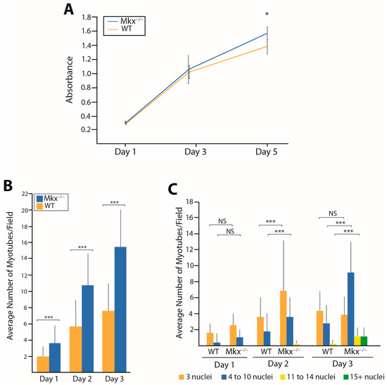 Comparison of proliferation and differentiation of Mkx−/− and WT satellite cells. (A) MTT assays were done using 6 × 104 cells/well on Cultrex-coated 24-well plates in growth medium. Data are average absorbance at 570 nm +/− s.d. of three biological replicates analyzed in triplicate. Significance was assessed by ANOVA, * p < 0.05. (B) Differentiation assays—1 × 105 satellite cells were seeded into Cultrex-coated 35 mm plates. At 24 h differentiation medium was added, cells were fixed at days 1–3, and nuclei stained with DAPI. Myotubes with a minimum of 3 nuclei were counted in 10 random 10× magnification fields/plate. Data are average myotubes/field +/− s.d. of 5 experiments. (C) Size distribution of myotubes based on number of nuclei. Data were analyzed by ANOVA, *** p < 0.001, NS = not significant.
