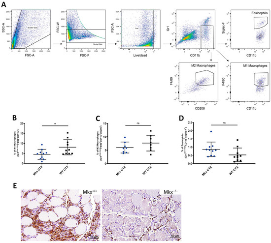 Deficit of M1 macrophages in Mkx−/− muscle after injury. M1 macrophages were significantly reduced in Mkx−/− muscle post-cardiotoxin injury. (A) Gating strategy for FACS analysis of macrophage and eosinophil populations in muscle. (B) Quantification of M1 macrophages, (C) M2 macrophages, and (D) eosinophils at 2 days post-injury in Mkx−/− and WT muscle. Data are the mean ± SD of 5 experiments, each experiment done with 5 mice, * p ≤ 0.05, ns—not significant. (E) Representative 10× magnification photomicrographs of anti-F4/80 I HC staining of injured WT and Mkx−/− muscle at 3 days post-injury.